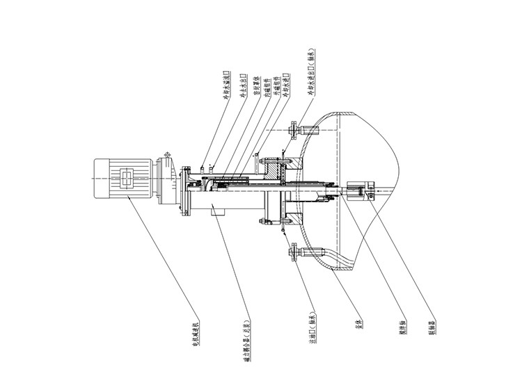 用稀土永磁制作的強磁回轉式耦合結構(磁力驅動裝置),磁力驅動裝置的基本制造材料均為鐵磁性物質,磁導率極佳,磁場在穿過用于密封合金層時幾乎沒有損耗。由此外部驅動永磁體產(chǎn)生的旋轉磁場可以有效被內部永磁體轉子接受,進而帶動反應器內的攪拌部件進行物料混合,攪拌速度為0~300r/min,甚至更高,可配推進、槳式、錨式、框式、螺帶等各種槳。